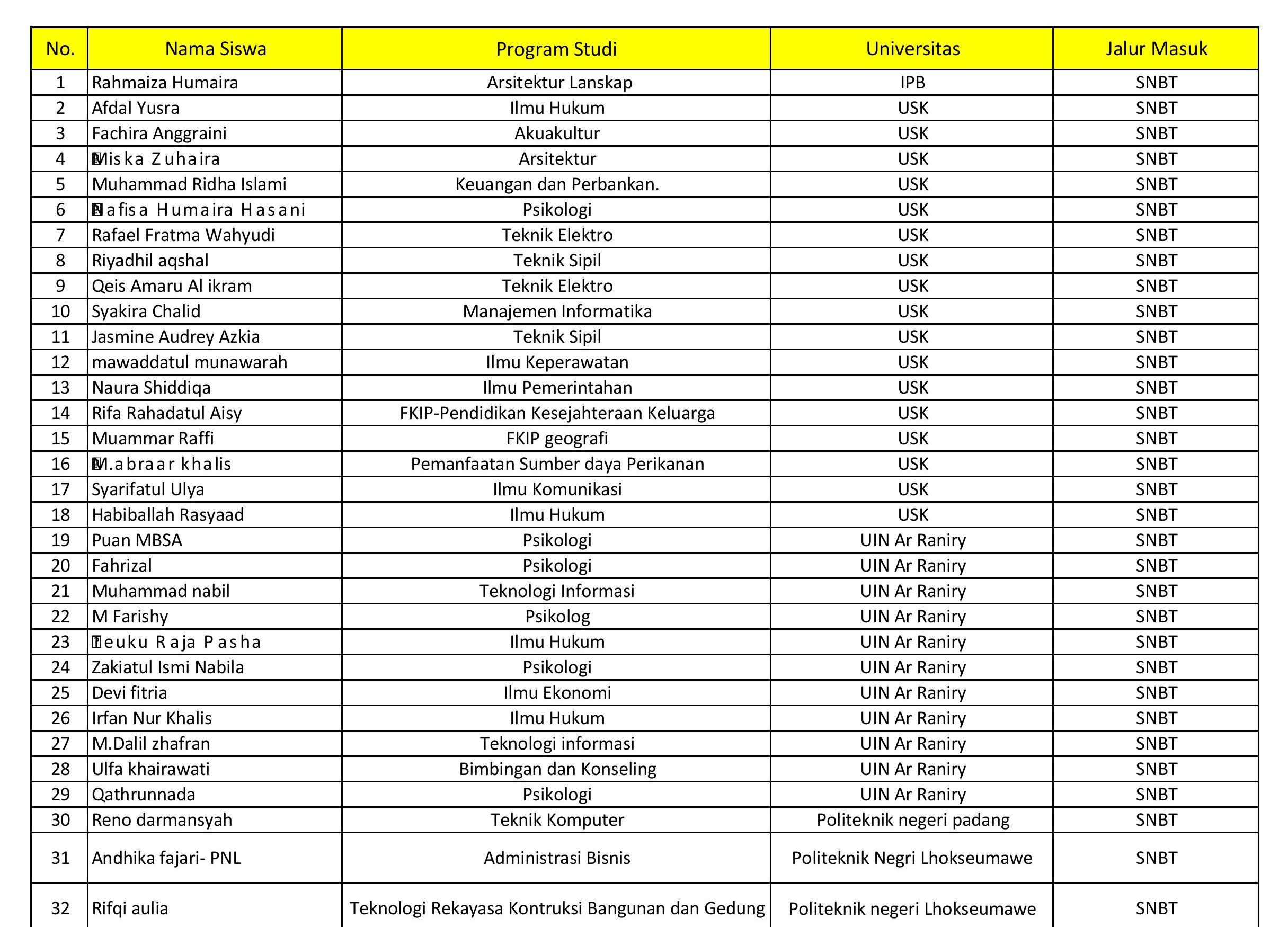 Madrasah Aliyah Tgk Chiek Oemar Diyan kembali menorehkan prestasi membanggakan. Sebanyak 32 orang santri kelas XII berhasil lulus dalam Seleksi Nasional Berdasarkan Tes (SNBT) 2025 dan diterima di berbagai perguruan tinggi negeri terkemuka di Indonesia.